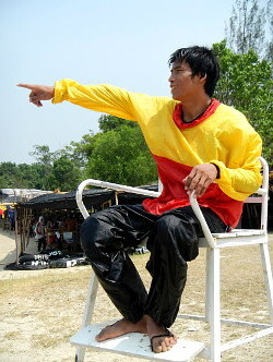 A beach has many challenges, like hidden rocks underwater, currents, sunburn and windchill. Have some food and shelter ready. Bring ponchos as windbreakers and changing rooms. Make sure your team wears appropriate clothing for the climate and to keep warm. Lifeguards carry specific rescue equipment which they have been trained to use and which is appropriate to the place where they work.